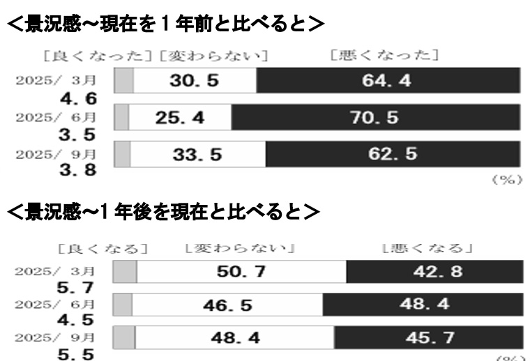 日銀が10日発表した2025年9月の「生活意識に関するアンケート調査」によると、「1年前と比べた現在の景況感」について「良くなった」の回答が3.8%となり、前回6月調査の3.5%から0.3ポイント上昇、「悪くなった」の回答は62.5%となり、前回から8.0ポイント低下した。また、1年後の見通しについては「良くなる」の回答が5.5%となり、前回6月調査から1.0ポイント上昇、「悪くなる」の回答は45.7%となり、前回から2.7ポイント低下した。景況感は若干だが改善している。