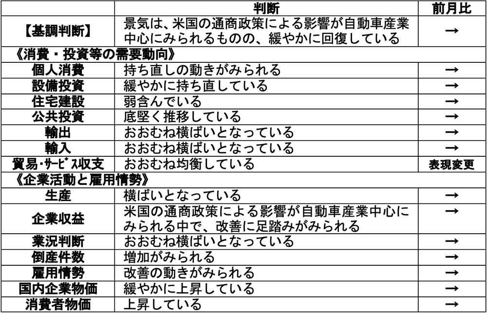 内閣府が22日に公表した1月の「月例経済報告」によると、国内景気の基調判断を「米国の通商政策による影響が自動車産業中心にみられるものの、緩やかに回復している」とし、前月の判断を据え置いた。個別項目では、「貿易・サービス収支」の判断を前月の「赤字になっている」から「おおむね均衡している」に表現変更したが、「個人消費」や「設備投資」などその他の項目については基調が変わっていないと判断した。