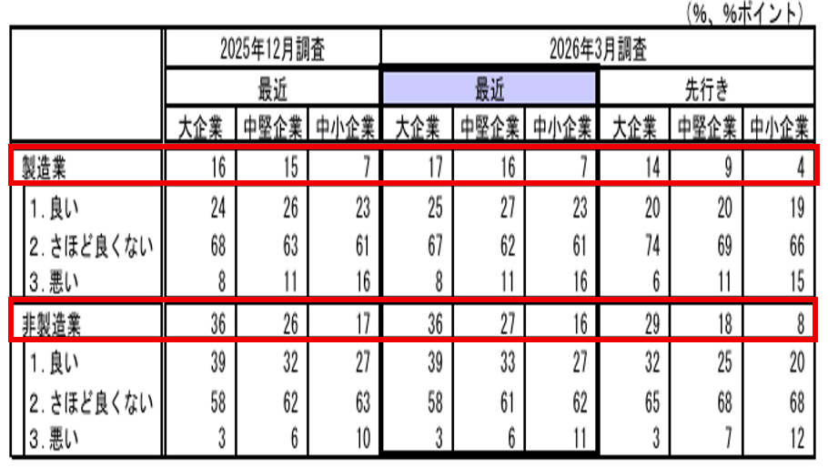 日⁠銀が1日に発表した3月「全国企業短期経済観測調査」(短観)によると、⁠大企業・製造業の業況判断指数(DI)⁠がプラス17となり、前回25年12月調査から1ポイント改善し4期連続での改善となった。プラス17は2021年12月以来の水準となる。中堅製造業は16(前回12月比1ポイント改善)、中小製造業は7(同横ばい)となる。一方、⁠大企業・非製造業の業況判断DIはプラス36となり、前回12月から横ばいとなった。但し、先行き判断では大企業製造業14(前回12月比1ポイント悪化)、大企業非製造業29(同2ポイント悪化)となるなど、製造業・非製造業とも全企業規模で悪化した。