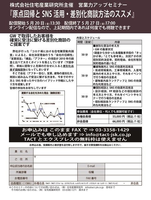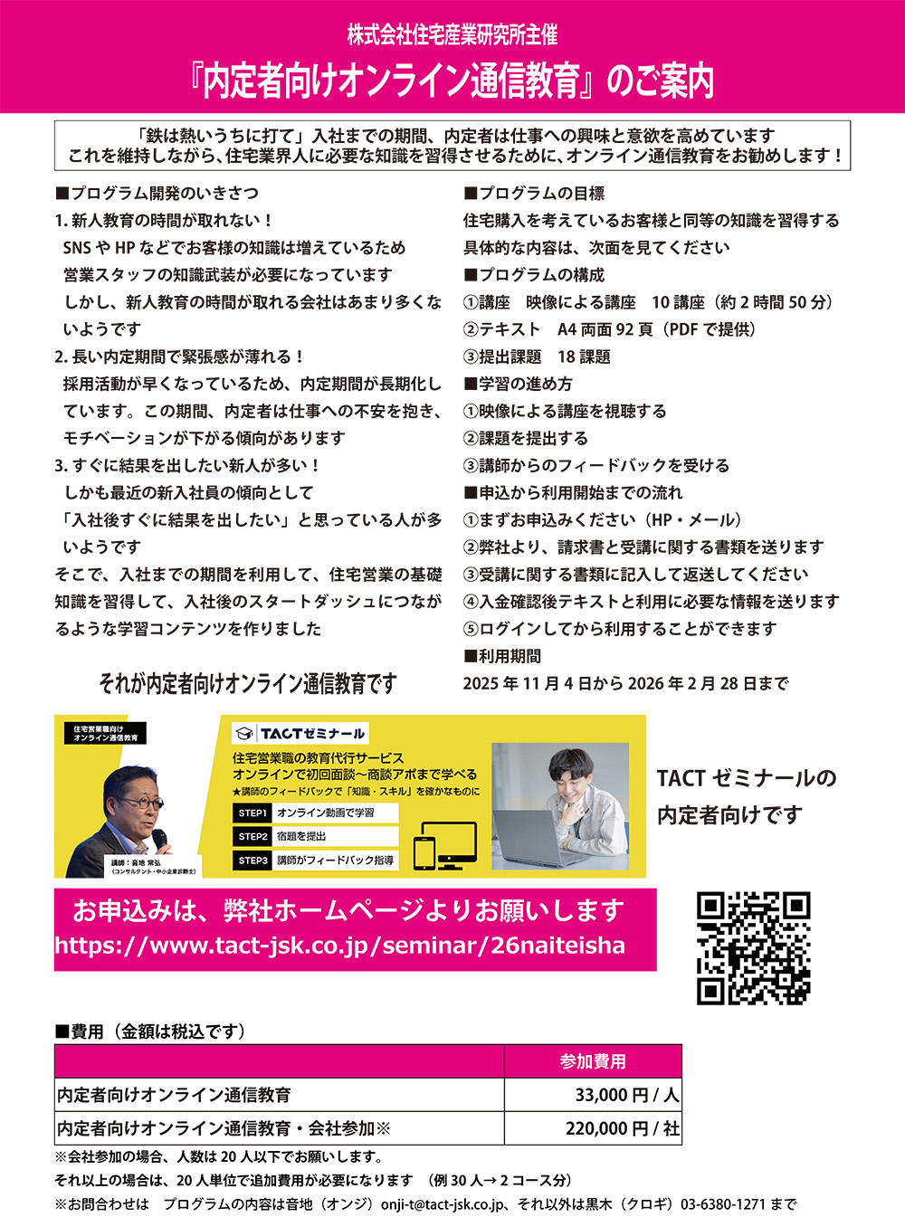 お申し込み 通信教育概要 「新人教育の時間が取れない!」 「長い内定機関で緊張感が薄れる!」 「すぐに結果を出したい新人が多い!」 そこで、入社までの期間を利用して、 住宅営業の基礎知識を習得して、 入社後のスタートダッ…続きを読む